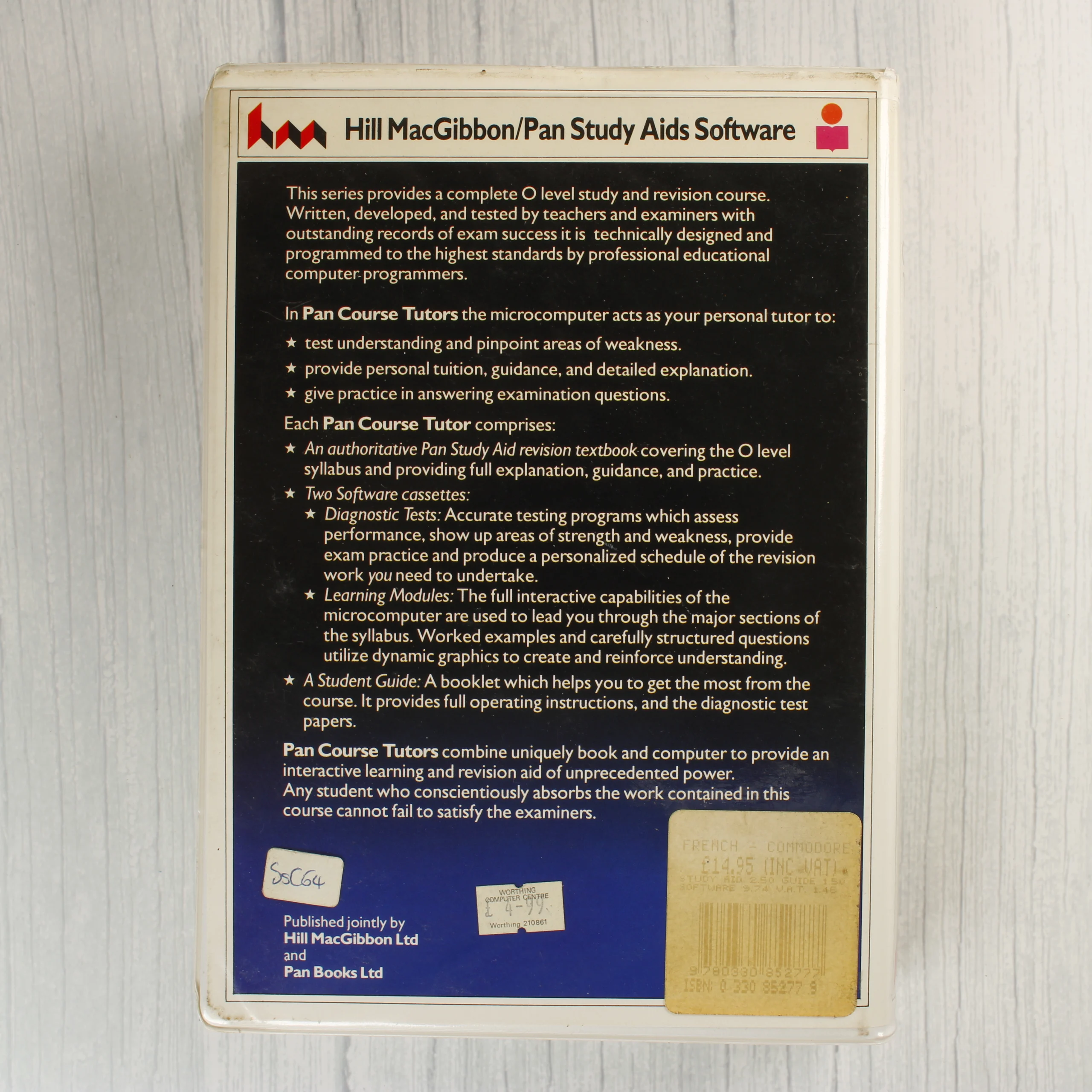 Pan Course Tutors French nyelvoktató szoftvercsomag Commodore 64-hez, két kazettával és kísérőfüzettel, Hill MacGibbon/Pan Books kiadásban.