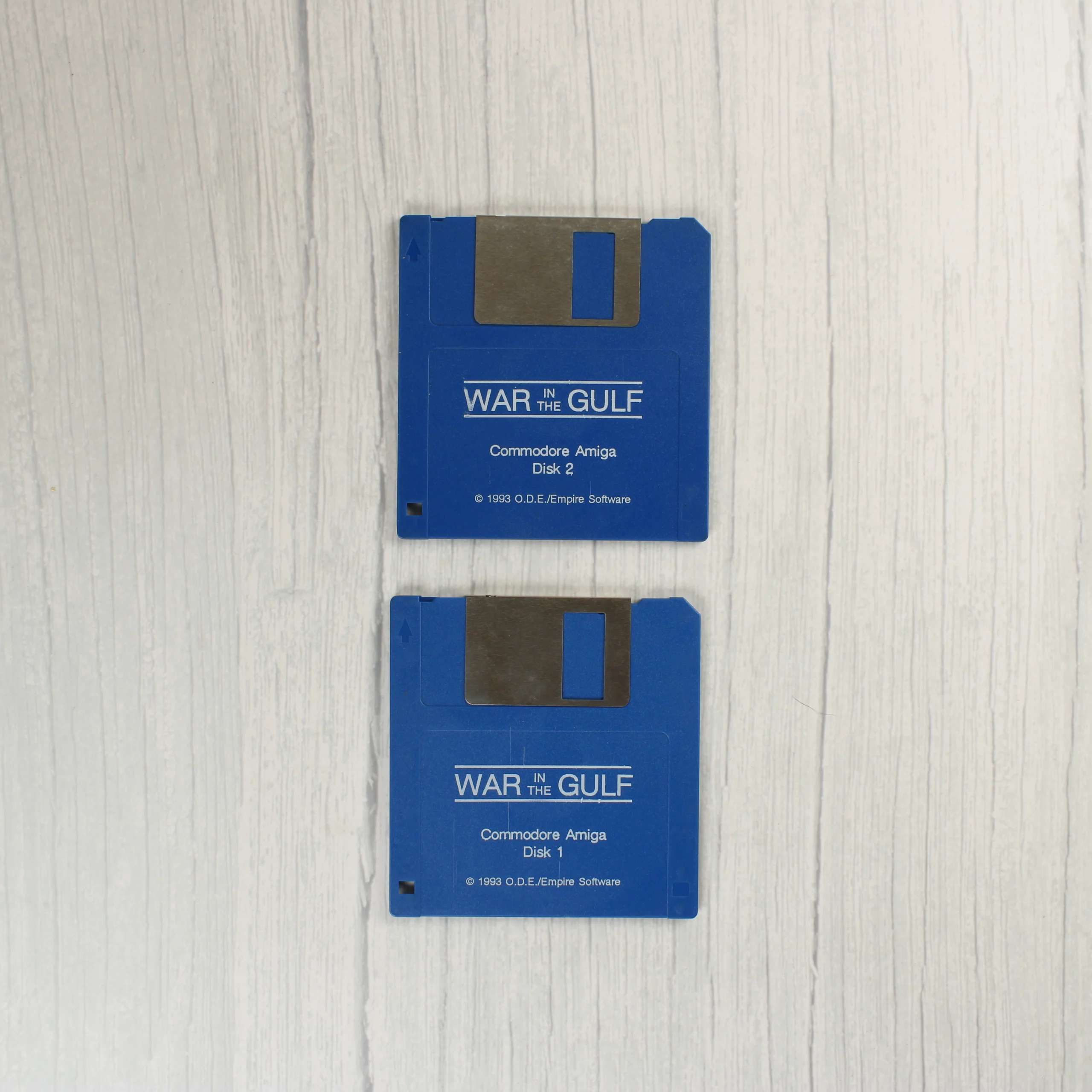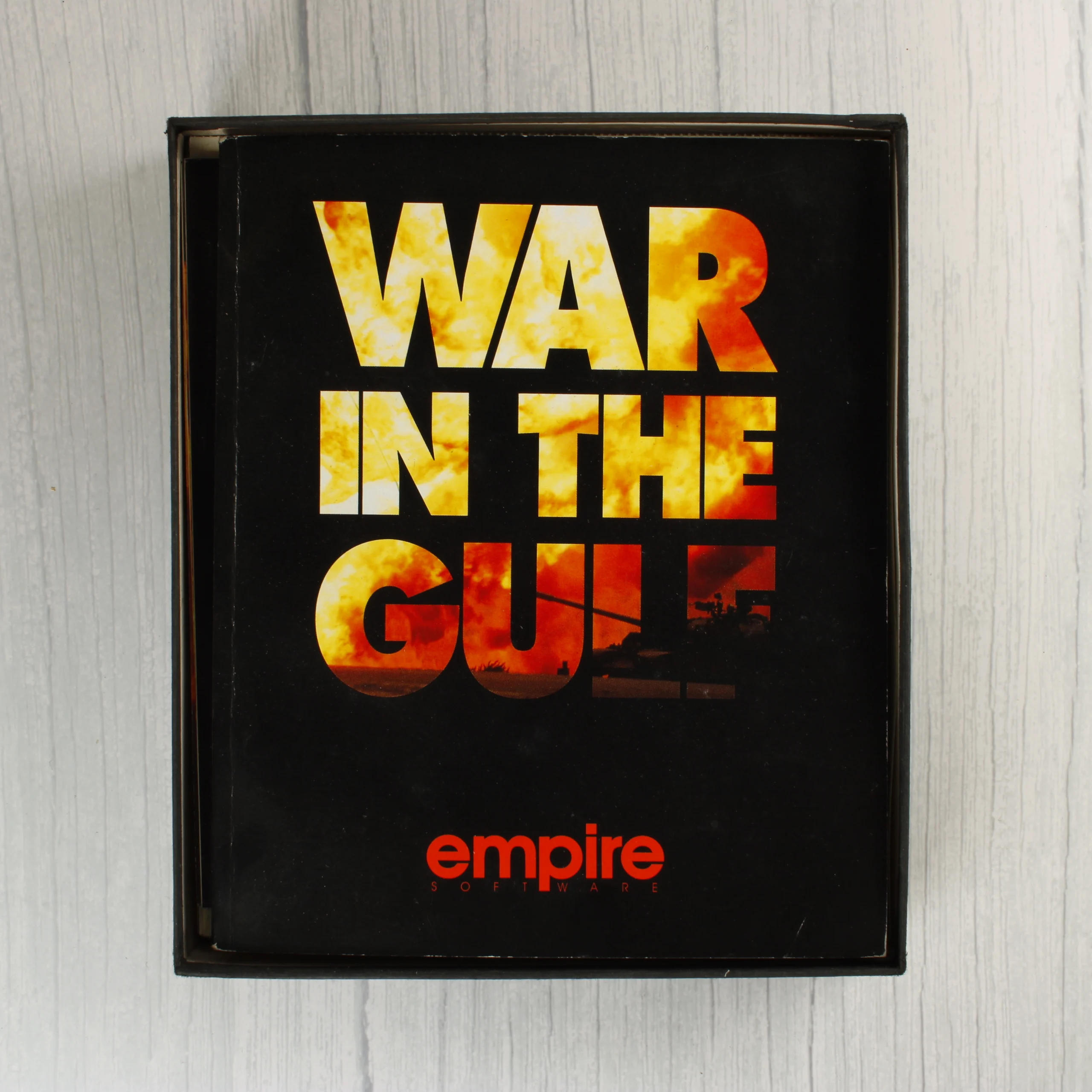 A War in the Gulf egy Commodore Amiga platformra megjelent harci szimulációs videójáték, amelyet az Empire Software adott ki 1993-ban. A csomag egy nagyméretű, kartonból készült dobozt tartalmaz, amelynek elején robbanást ábrázoló grafika látható. A készlet része két darab kék színű, 3,5 colos floppy lemez, egy részletes használati útmutató, valamint egy nagyméretű, színes papírtérkép Kuvait területéről. A dobozban továbbá fekete-fehér és színes illusztrációkat tartalmazó kiegészítő lapok is találhatók. A kiadvány a Home Computer Club Edition változata, amely hét extra küldetést tartalmaz. A doboz hátoldalán angol nyelvű leírás és képernyőmentések láthatóak a játékról.