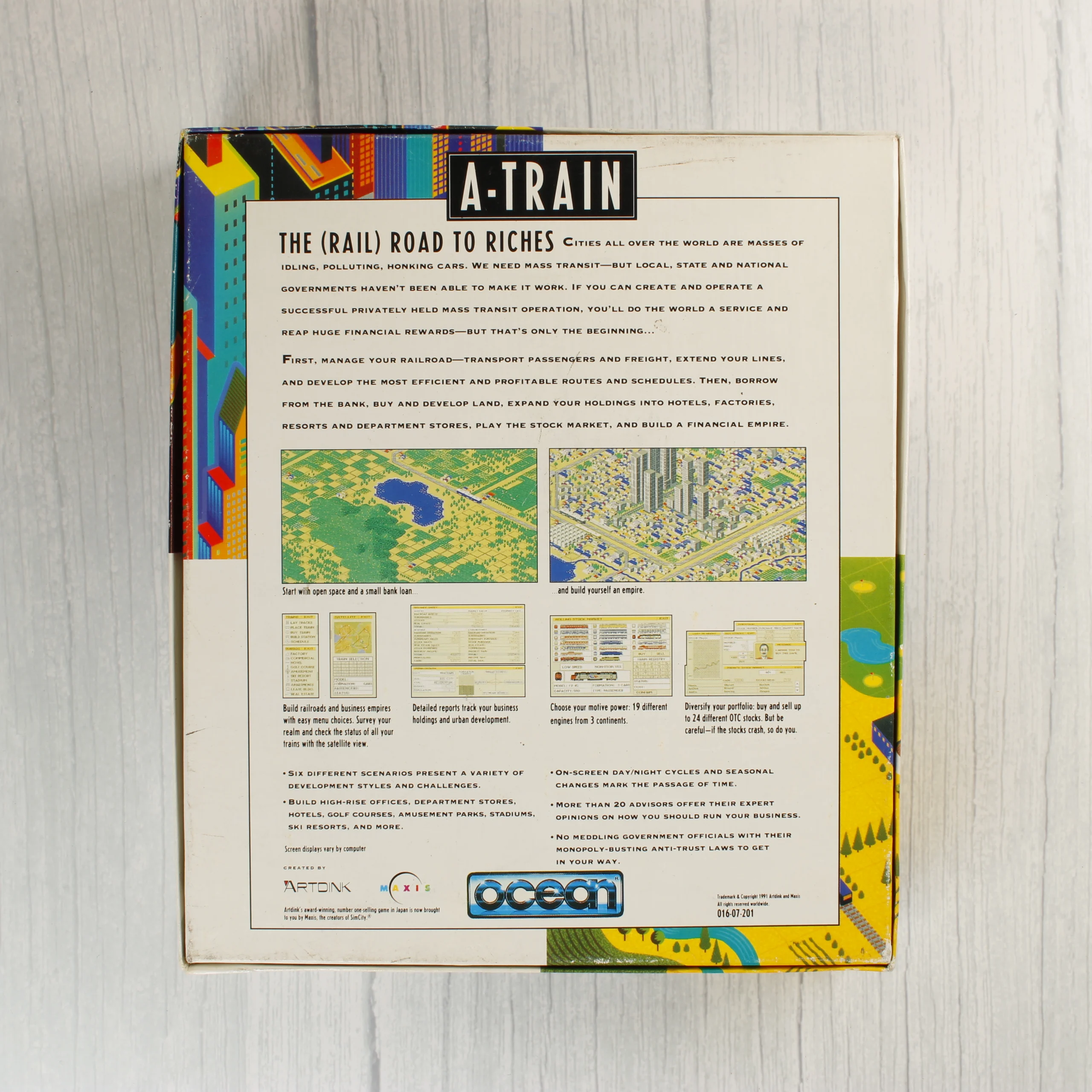 Az A-Train egy Amiga platformra megjelent gazdasági szimulációs videójáték, amelynek dobozos kiadása látható a képeken. A csomag tartalmazza az eredeti kartondobozt, egy színes felhasználói kézikönyvet és két darab kék színű, 3,5 colos floppy lemezt. A lemezeken angol nyelvű verziók találhatók, külön Lo-Res és Hi-Res grafikához. A doboz elején színes, izometrikus városkép látható vonatokkal, valamint az Ocean, az Artdink és a Maxis logói. A hátoldalon a játékmenetet bemutató képernyőképek és angol nyelvű leírás olvasható. A termék használt, a doboz szélein és sarkain kopások, valamint a felületén kisebb foltok és egy régi matrica nyoma látható.